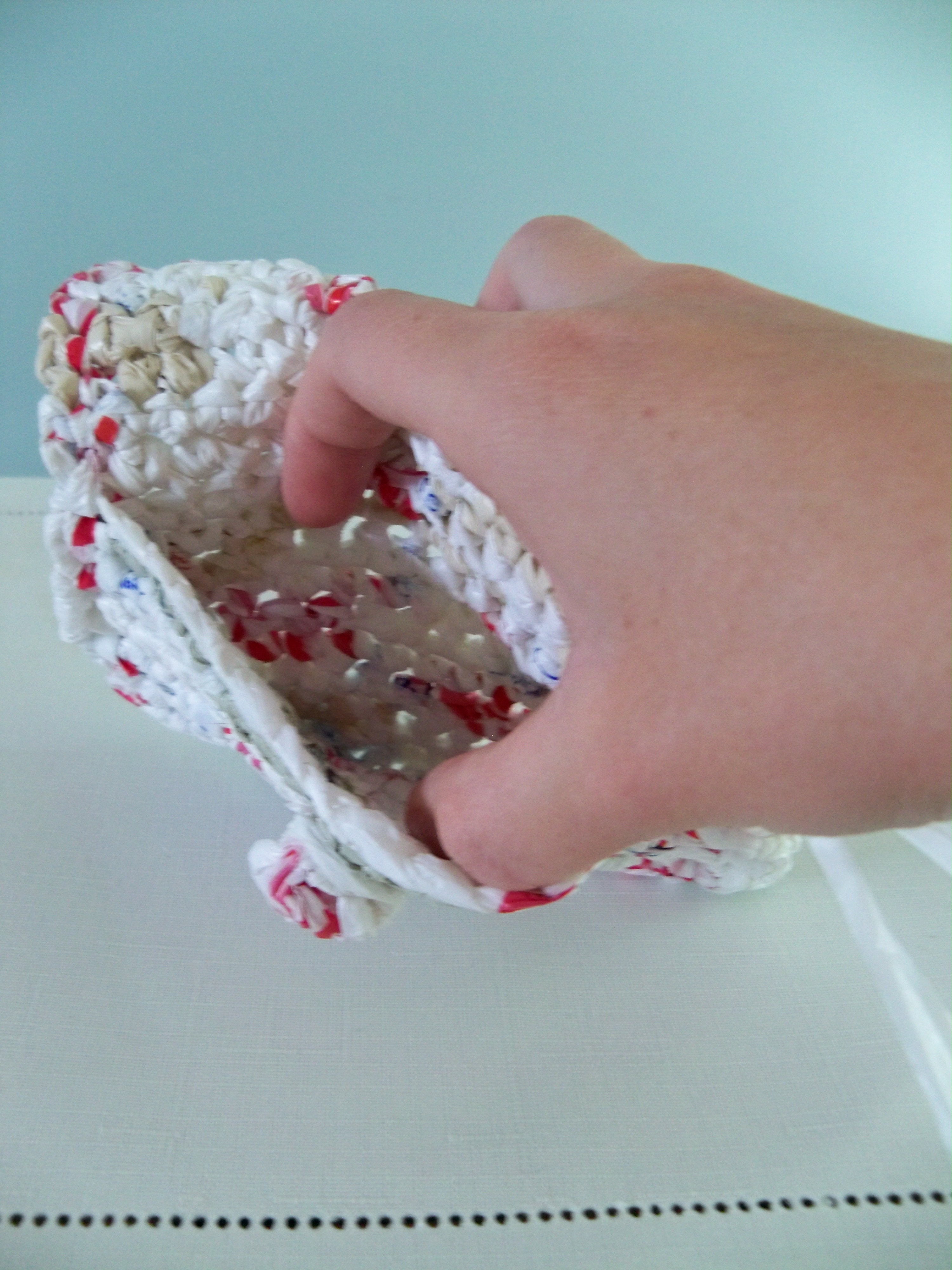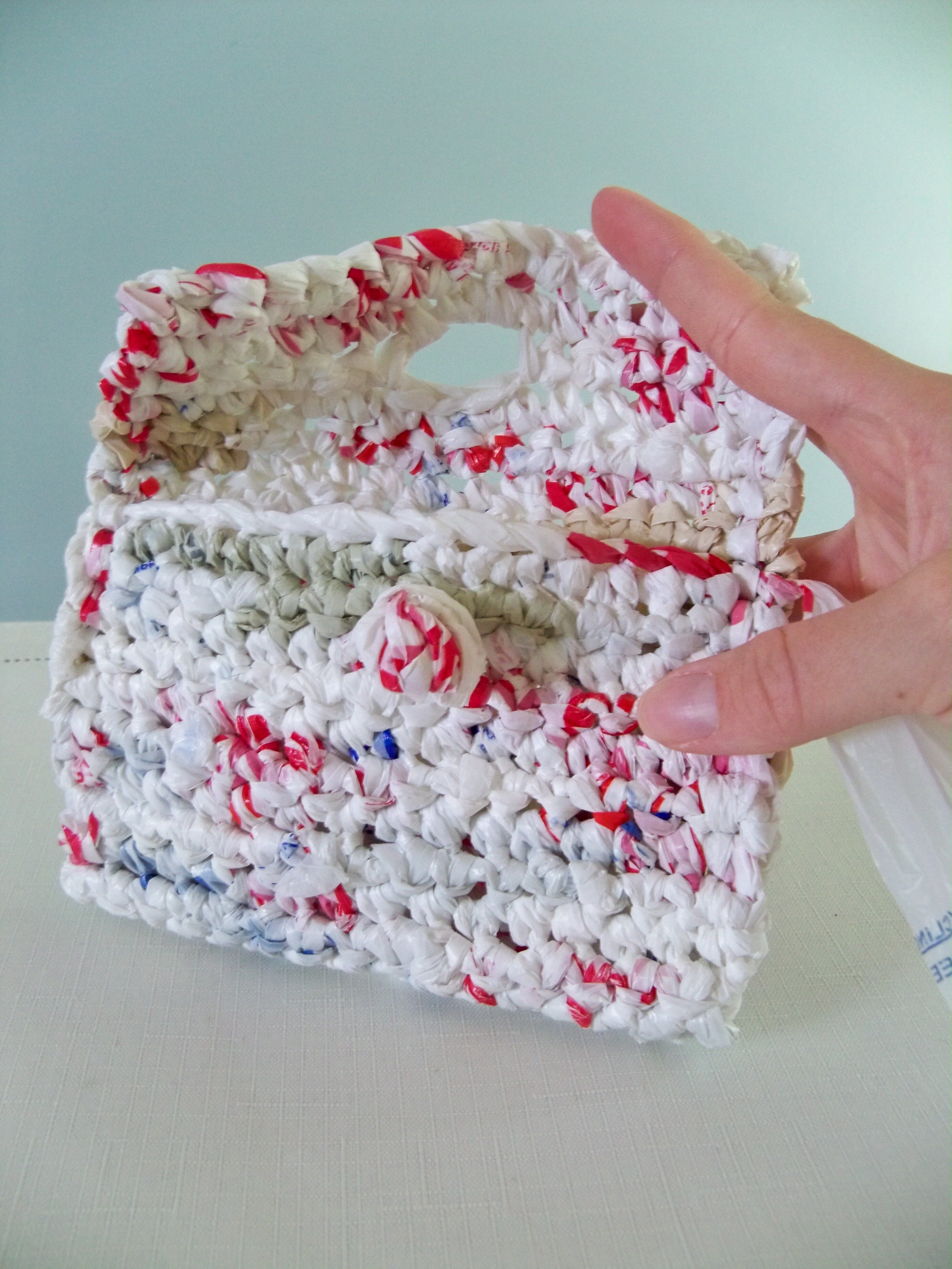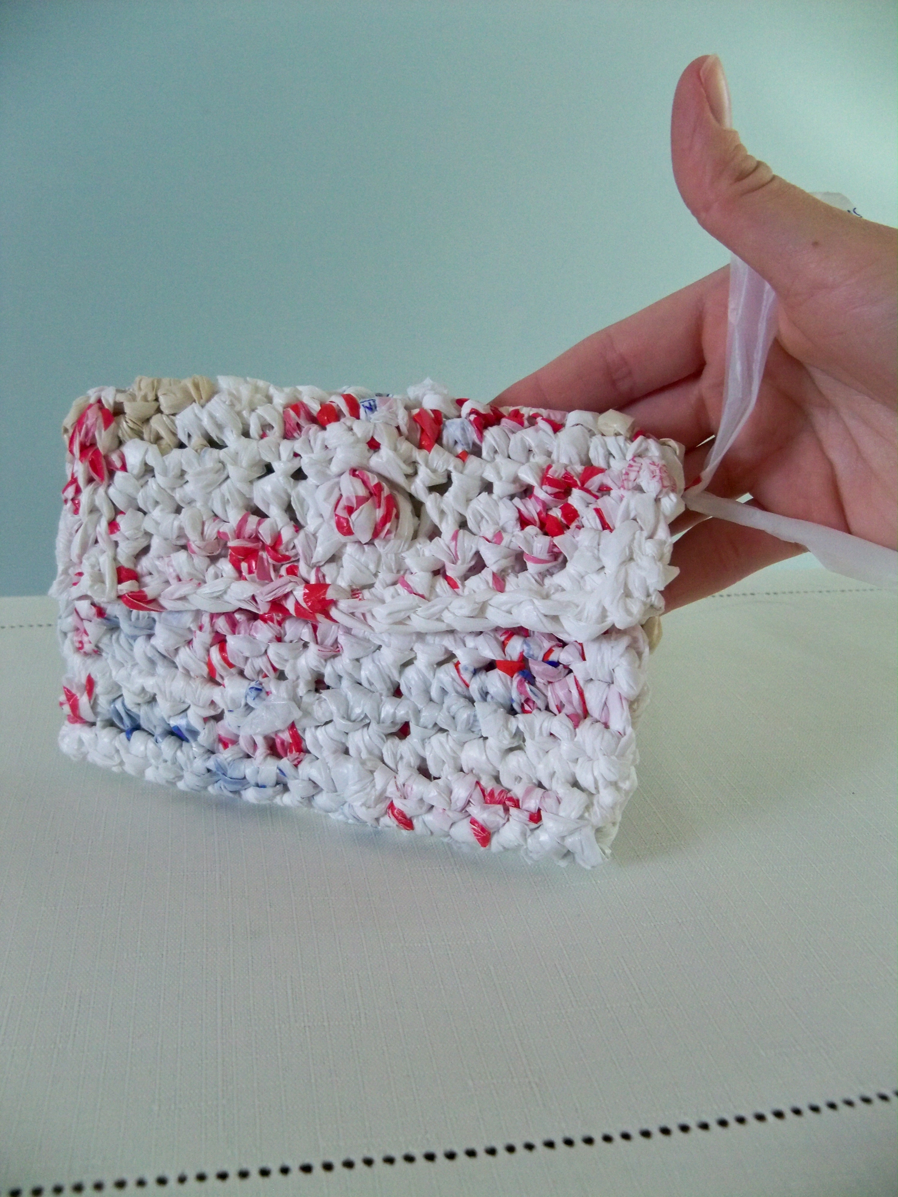 Crocheted using recycled plastic bags, each BAGbag item has it's own unique look. This BAGbag wallet/change purse was designed for everyday use. It is heavy duty and tightly stitched.