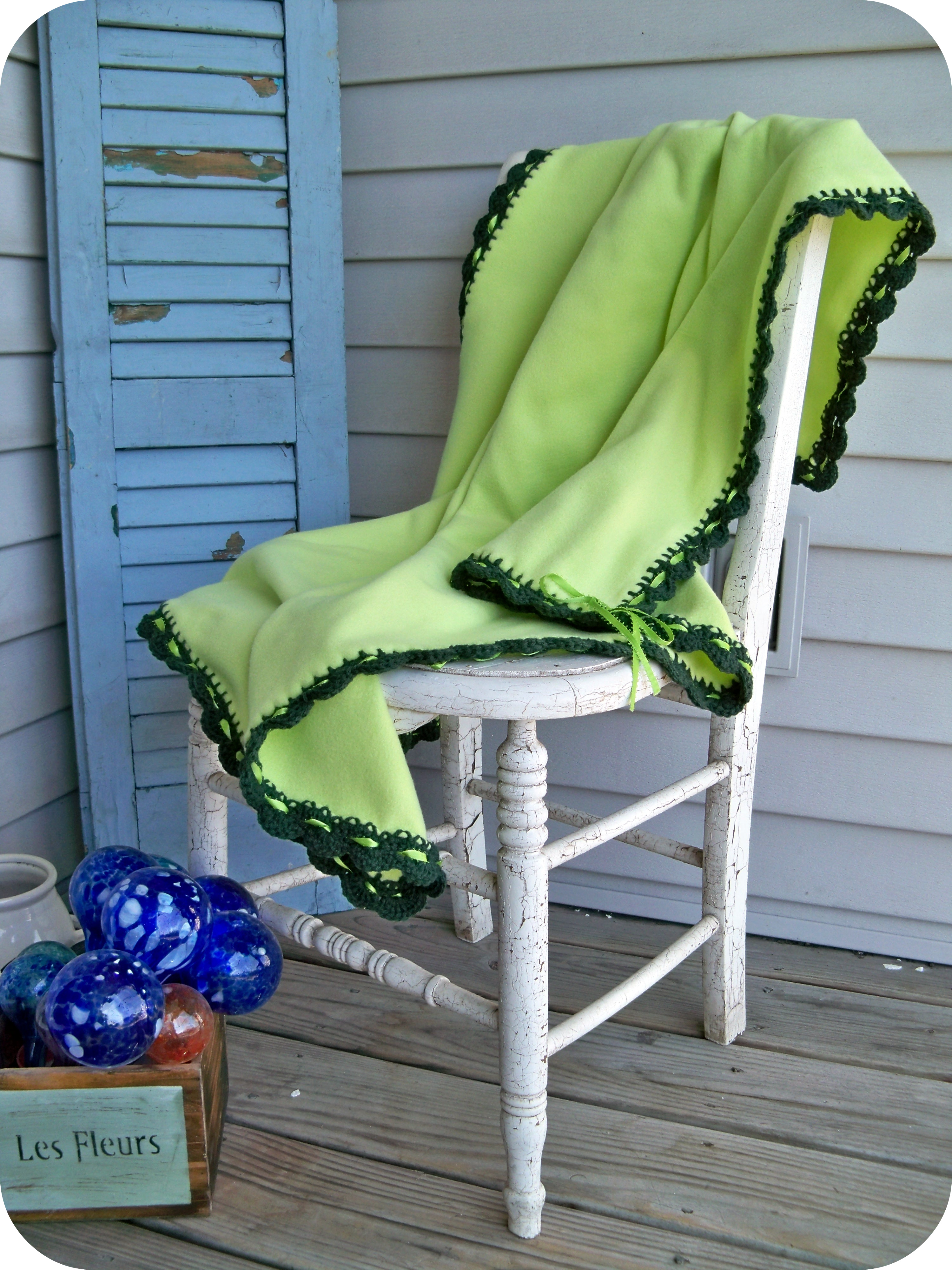 Made of high quality fleece with crochet edging in super soft 100% premium acrylic yarn. Double-faced satin ribbon woven into edging. Measures approximately 36" by 50".